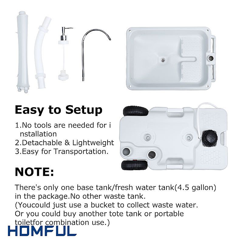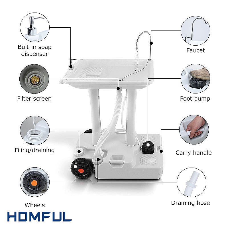 The capacity of the freshwater tank of this hands-wash stand is 30L, it can satisfy your great need for water on your journey, and it surely accommodates plenty of travelers or campers in each refill. And the capacity of the liquid soap tank is 5L, the foot pump ability is 200ml, and the liquid soap dispenser ability is 1ml. This portable hand-wash sink is multi-functional.In addition to the basic faucet, filling, and draining, it also contains a built-in soap dispenser, filter screen, foot pump, carry handle, draining hose, and wheels. It meets all your needs on your trip. The hands-free operation by steeping on the foot pump and built-in soap dispenser keeps your hygiene. The filter screen efficiently filters solid material and avoids clogging, so you can wash your hands and the food like fruits, vegetables, etc. And this sink can not only be used alone but also in combination with the toilet; multifunctional and beautiful. The design of large wheels and lifting handles is portable and easy for transportation. You can carry it everywhere when you go outside. And with its simple and detachable design, no tools are needed for installation. You only need to pay about 10 min to install it. It’s very easy to set up. When you are not using it, you can easily disassemble it and don’t need to use tools.
