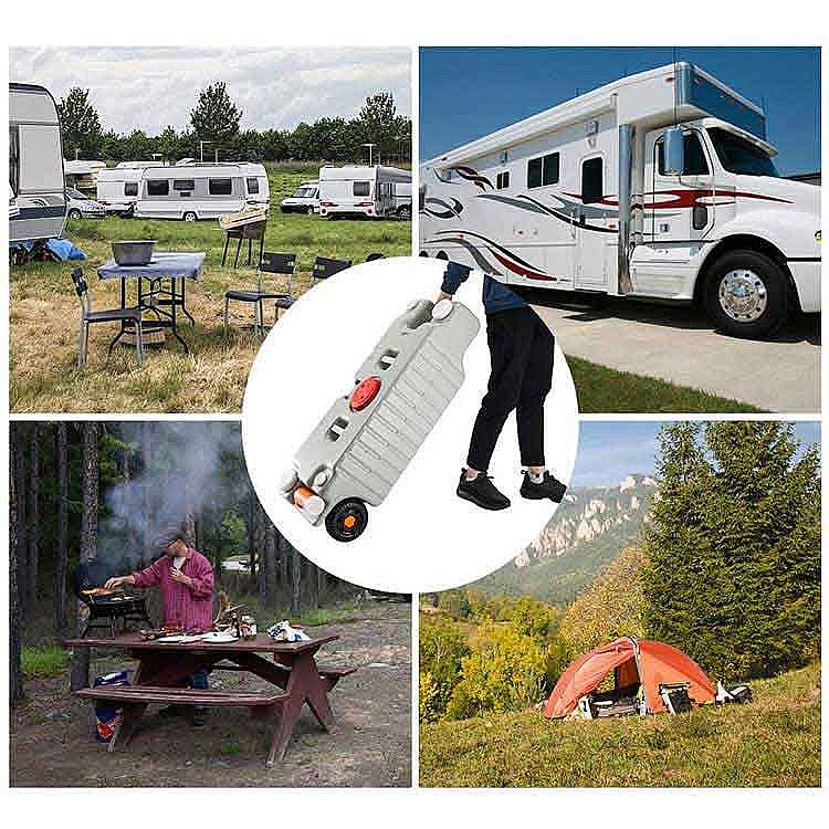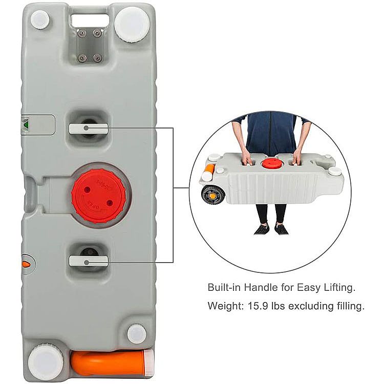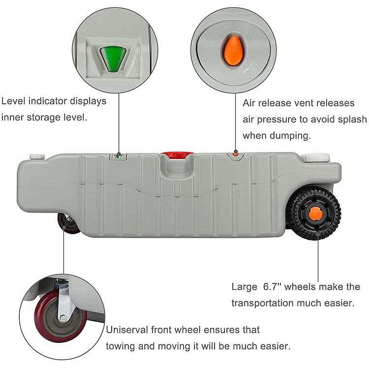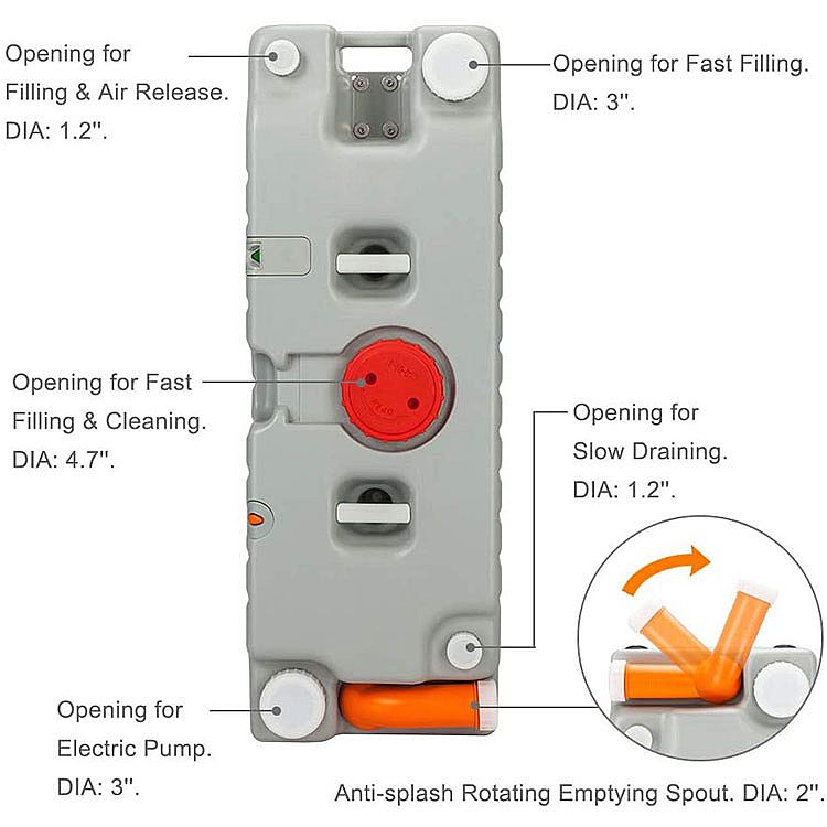 Puedes usarlo para transportar agua limpia o un tanque de desechos. La manguera adjunta puede coincidir con el orificio inferior, por lo que puede vaciar el agua más rápidamente sin salpicar.