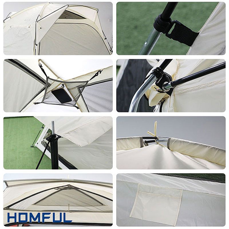Die Oberseite des Zeltes hat zwei kleine dreieckige atmungsaktive Fenster, die die Atmungsaktivität des Zeltes erhöhen sollen. Wenn Sie diese im Sommer verwenden, fühlen Sie sich sehr kühl und nicht atmungsaktiv. Das Zelt besteht aus Fiberglasstangen. Glasfaserstäbe sind langlebig, brechen nicht leicht und sind erschwinglich. Fiberglasgestänge machen das Gesamtgewicht des Zeltes leichter und einfacher zu tragen. Die Oberseite des Zeltes hat einen S-Haken zum Aufhängen von Lichtern. An der Oberseite befinden sich Haken für Handys, Zeitschriften usw. Außerdem gibt es zwei Taschen im Inneren des Zeltes, um den Stauraum zu vergrößern.