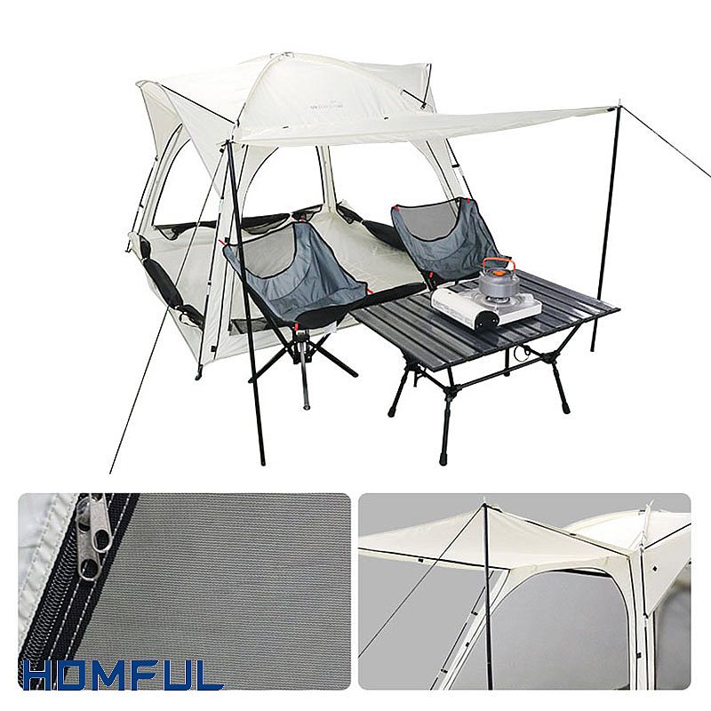 Wenn Sie das Fenster außerhalb des Netzes hochziehen, bietet es einen schönen privaten Raum. Dies ist eine gute Option für Menschen, die ausreichend Schlaf und Privatsphäre benötigen. Darüber hinaus ist ein Ende des Zeltes mit zwei Stangen ausgestattet, die die Zelttür als Baldachin stützen können und einen guten Unterhaltungsraum bieten. Unter diesem einfachen Baldachin können Sie einen Tisch und zwei Stühle platzieren. Erweitern Sie den Zeltnutzungsraum. Es ist ein Zelt, das mehrere Verwendungszwecke hat. Dieses Campingzelt ist perfekt für Familienausflüge.
