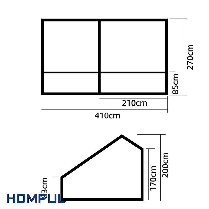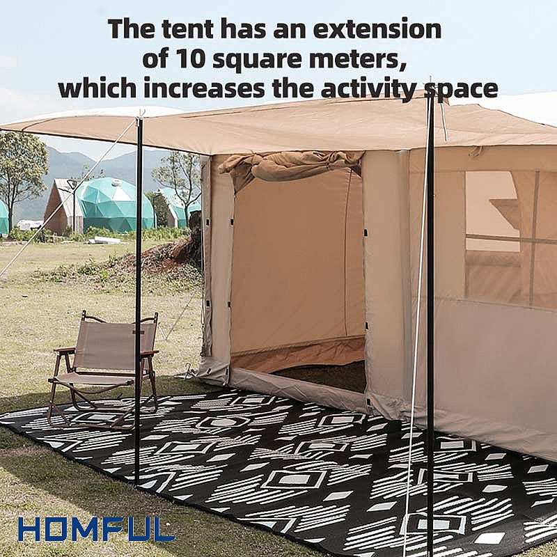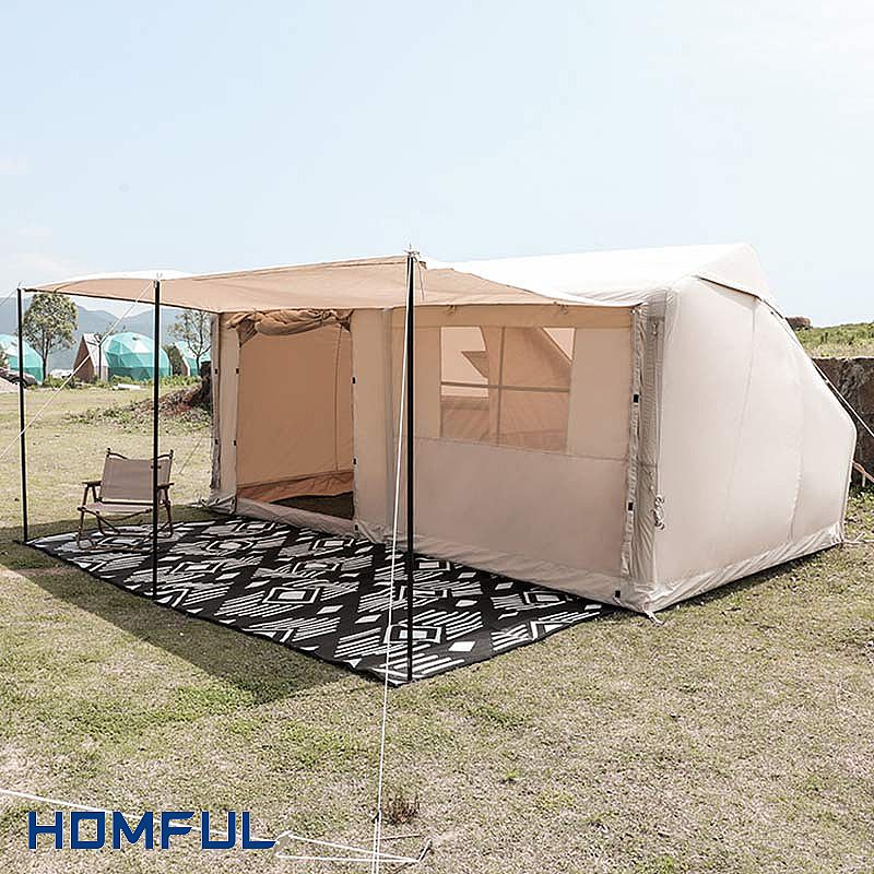 Für Gruppen, die als Familie campen, ist der Zeltplatz definitiv die erste Wahl. Dieses aufblasbare Zelt bietet viel Platz für 2-4 Personen. Das Zelt umfasst 12 Quadratmeter, mit einem Schlafzimmer und einem Wohnzimmer. Es erfüllt nicht nur den Aktivitätsraum, sondern bietet auch einen geräumigen Schlafplatz. Ein aufblasbares Doppelbett passt in das Schlafzimmer und es wird nicht zu voll. Darüber hinaus verfügt die Außenseite des Zeltes über eine Erweiterung, die als Vordach verwendet werden kann, um den Platz für Aktivitäten zu vergrößern. Jedes Zelt erhält 3 Eisenstangen. Es spendet nicht nur Schatten, sondern erweitert auch den vom Zelt genutzten Raum.