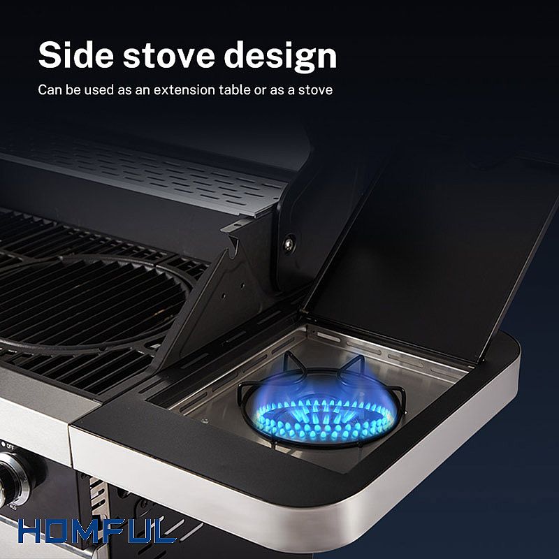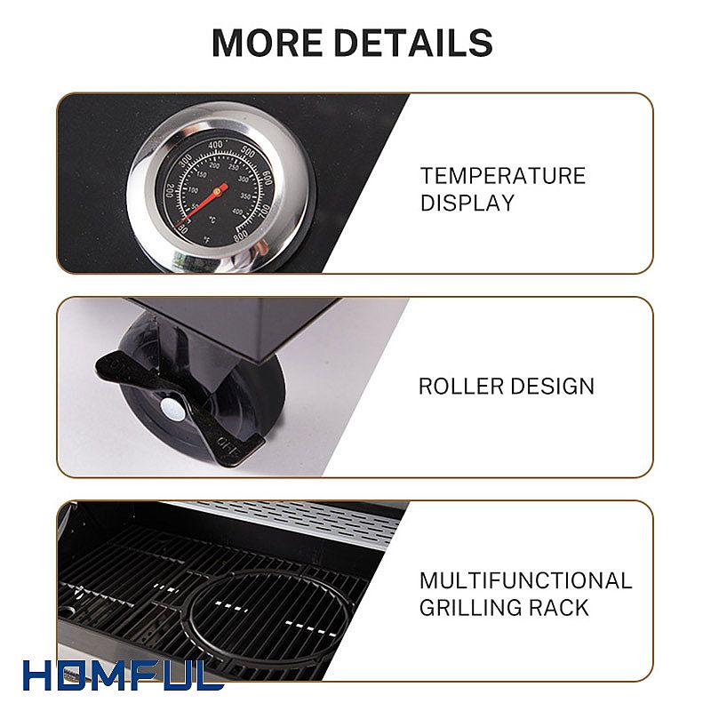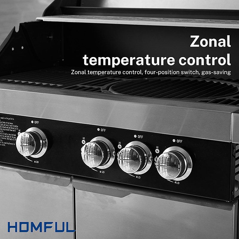 Homful 4 Brenner Gas BBQ Grill mit automatischer Zündung und integriertem Thermometer silbernen Gasgrill. Vier Räder, mit einem Seitentisch und Seitenherd Design.. Eigenschaft:. 1. 4-Brenner Gas BBQ. 2. 59*43 cm große Kochfläche, die kulinarische...