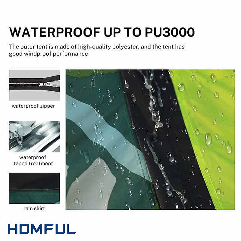 Die Homful Group hatte also eine Idee. Welche Art von Zelt kann diese Situation lösen? Durch unser Design und unsere Forschung wurde ein neues Campingzelt geboren. Dieses Zelt kann alleine verwendet werden; Wenn es alleine verwendet wird, ist es ein 2-3-Personen-Zelt. Das Zelt kann aber auch verbunden werden, um das Zelt zu einem Mehrpersonenzelt zu machen. Wir haben die Tür des Zeltes verbessert. Wir haben oben am Zelt einen Reißverschluss angebracht, damit das Zelt durch den Reißverschluss verbunden werden kann. Wir imprägnieren den Nähteil des Reißverschlusses, um zu verhindern, dass Wasser durch die Reißverschlussverbindung sickert. Und um das Zelt perfekt wasserdicht zu machen, haben wir auch wasserdichte Reißverschlüsse verwendet.