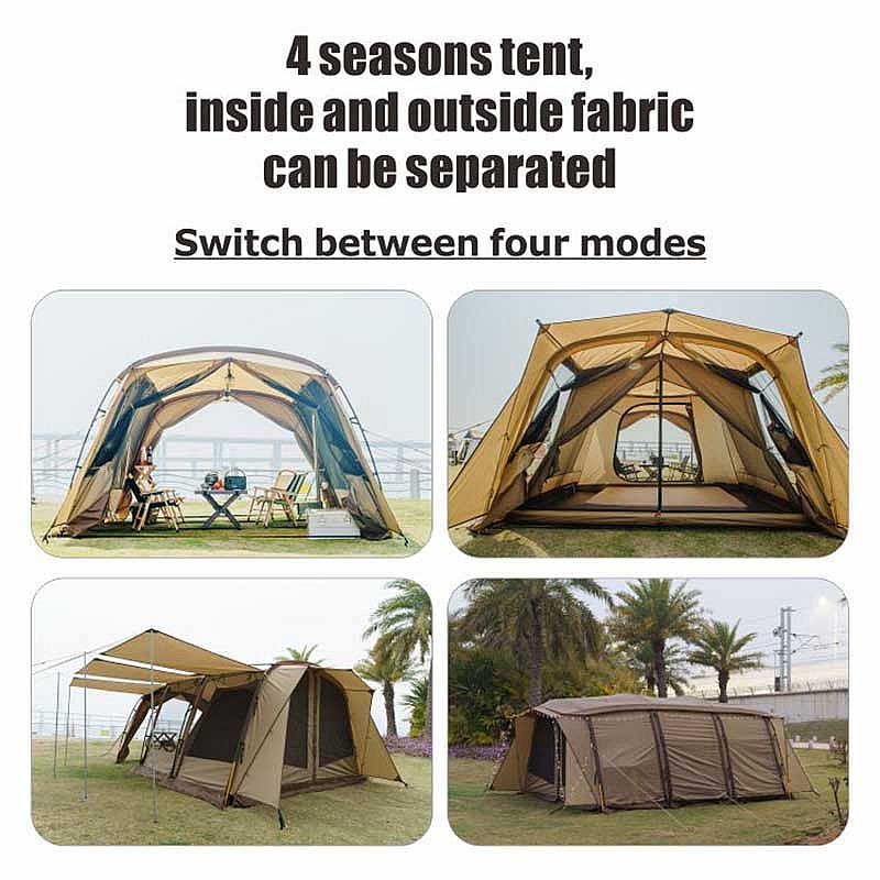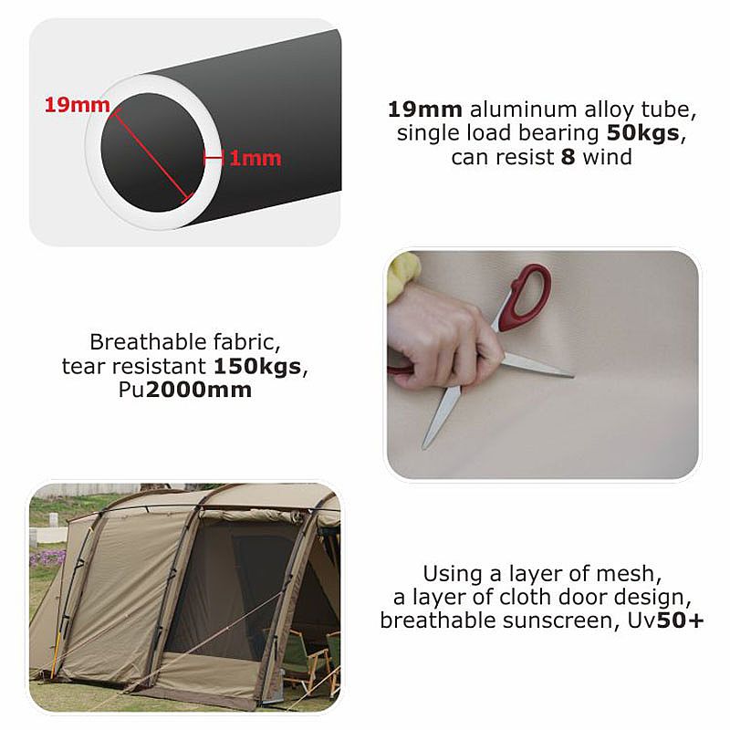 Knitterfestes Gurtband macht das Zelt steifer. Der Schneefang isoliert effektiv Regen und Sand. Durch die Kabelöffnung des Innenzeltes kann der Draht problemlos verwendet werden, während das Erscheinungsbild erhalten bleibt und gleichzeitig Mücken verhindert werden. Wasserdichte Streifen verhindern das Auslaufen von Wasser bei Regen. Aufbewahrungstaschen und Aufbewahrungstaschen im Innenzelt erleichtern das Verstauen von Gegenständen.