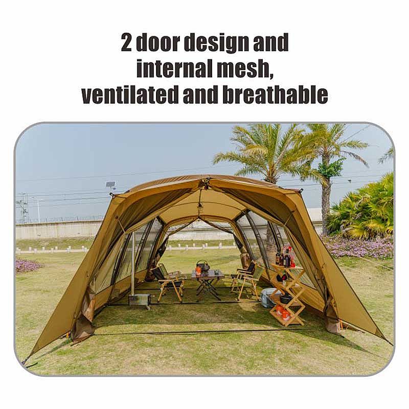 Das Außenzelt hat 6 Fenster und je zwei Vorder- und Hintertüren. Die hervorragende Belüftungswirkung wird von vielen Zelten nicht erreicht! Auch im heißen Sommer spürt man die Kühle im Freien. Fenster und Türen haben Bildschirmdesigns, die Mücken effektiv isolieren und auch leichtem Regen widerstehen können. Draußen den Regentropfen zuzusehen und im Zelt eine Tasse Kaffee zu trinken, ist der ultimative Campinggenuss.